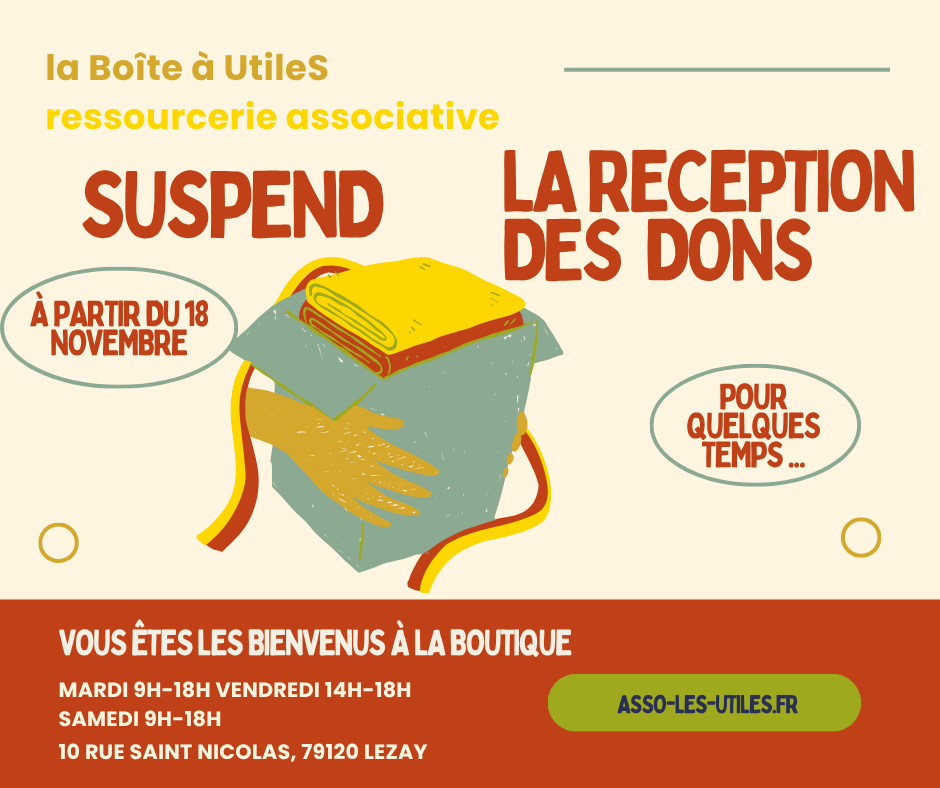 Aussi, il ne sera momentanément plus possible de déposer vos objets à la ressourcerie à partir du 18 novembre 2025.