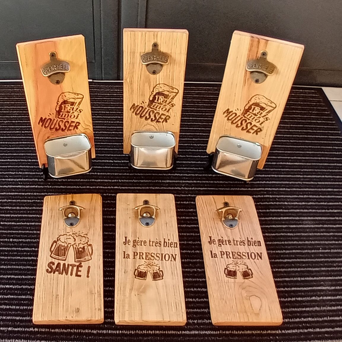 J’ai fabriqué des décapsuleurs muraux avec des chutes de bardage de châtaigner (issus de la fabrication d’un chalet) et de boîtes de conserves pour récupérer la capsule !